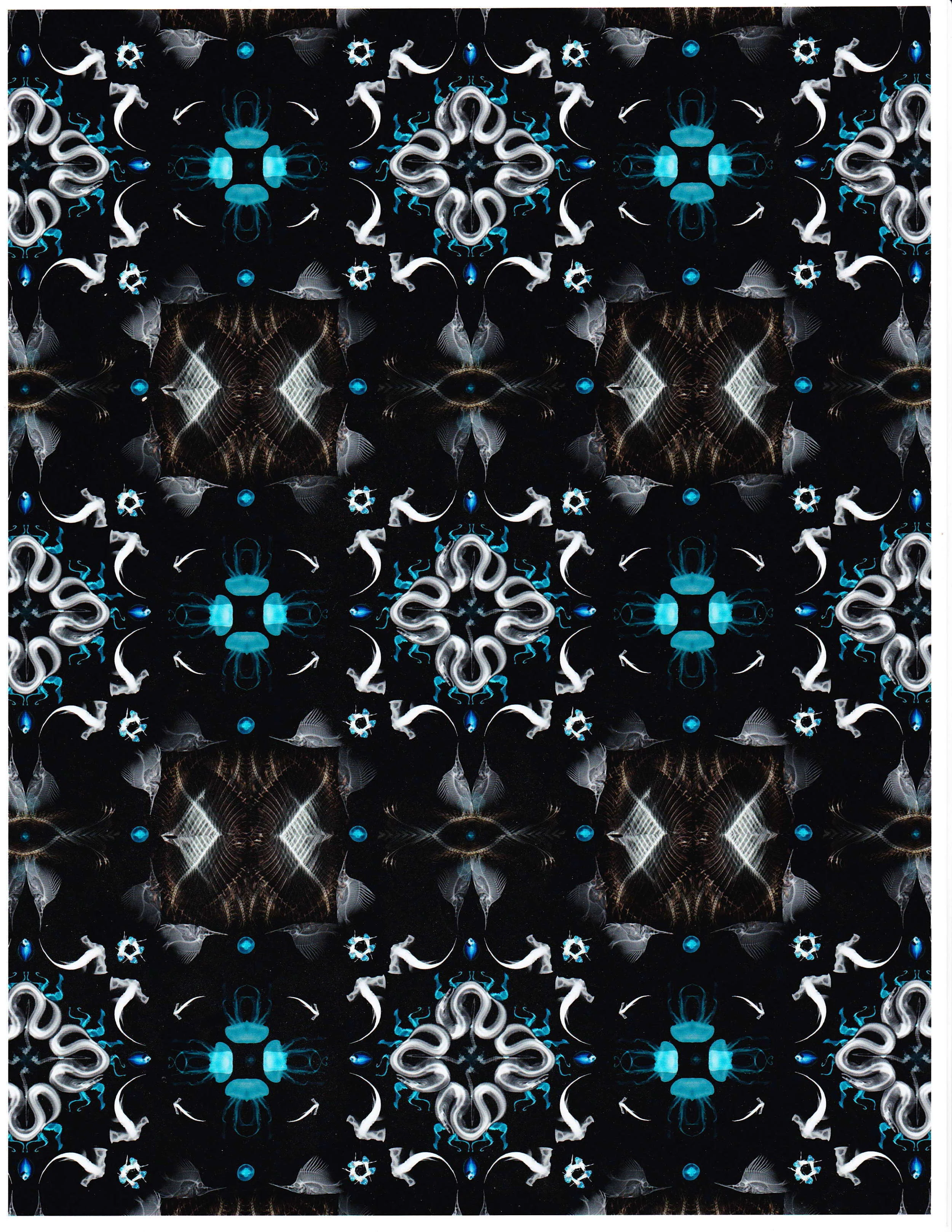 The chosen 'thing' are x-rays of fish- intertwining amongst each other from different blocks of design that combine into one graphic pattern.